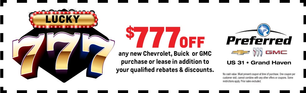 We're giving you $777 off any new Chevrolet, Buick or GMC purchase or lease! This is in addition to any qualifying rebates and discounts!