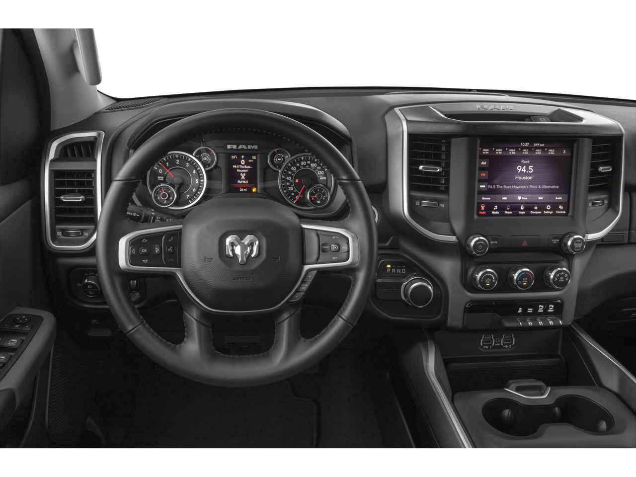 Big Horn Level 1 Equipment Group (2nd Row In Floor Storage Bins, Auto-Dimming Rear-View Mirror, Big Horn IP Badge, Black Premium Power Mirrors, Class IV Receiver Hitch, Cluster 3.5 TFT Color Display, Foam Bottle Insert (Door Trim Panel), Glove Box Lamp, Power 4-Way Driver Lumbar Adjust, Power 8-Way Driver Seat, Power Adjustable Pedals, Radio: Uconnect 4 w/8.4 Display, Rear Dome w/On/Off Switch Lamp, Rear Power Sliding Window, Rear Window Defroster, SiriusXM Satellite Radio, Sun Visors w/Illuminated Vanity Mirrors, and Universal Garage Door Opener), Quick Order Package 25Z Big Horn (Big Horn Badge), 3 Rear Seat Head Restraints, 3.21 Rear Axle Ratio, 4 Way Front Headrests, 4-Wheel Disc Brakes, 48V Belt Starter Generator, 6 Speakers, ABS brakes, Air Conditioning, Alloy wheels, AM/FM radio, Brake assist, Bumpers: chrome, Cloth Bench Seat, Compass, Delay-off headlights, Driver door bin, Dual front impact airbags, Dual front side impact airbags, Electronic Stability Control, Front anti-roll bar, Front Center Armrest w/Storage, Front fog lights, Front reading lights, Front Seat Back Map Pockets, Front wheel independent suspension, Fully automatic headlights, GPS Antenna Input, Heated door mirrors, Illuminated entry, Leather steering wheel, Low tire pressure warning, Occupant sensing airbag, Outside temperature display, Overhead airbag, Overhead console, Panic alarm, ParkView Rear Back-Up Camera, Passenger door bin, Passenger vanity mirror, Power door mirrors, Power steering, Power windows, Radio data system, Radio: Uconnect 3 w/5 Display, Rear 60/40 Folding Seat, Rear anti-roll bar, Rear seat center armrest, Rear step bumper, Remote keyless entry, Remote Start System, Speed control, Split folding rear seat, Steering wheel mounted audio controls, Tachometer, Telescoping steering wheel, Tilt steering wheel, Traction control, Trip computer, Variably intermittent wipers, Voltmeter, and Wheels: 18 x 8 Cast-Aluminum Painted.