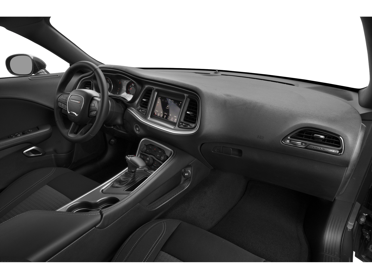 Blacktop Package (Black Fuel Filler Door, Black Grille w/Bezel, Challenger Blacktop Grille Badge, Gloss Black I/P Cluster Trim Rings, Leather Performance Steering Wheel, Rear Black Spoiler, Satin Black Dodge Tail Lamp Badge, and Wheels: 20 x 8.0 Black Noise Painted), Cold Weather Group (180 Amp Alternator, Heated Front Seats, and Heated Steering Wheel), Quick Order Package 2EA, 4-Wheel Disc Brakes, 6 Speakers, ABS brakes, Air Conditioning, Alloy wheels, AM/FM radio, Anti-whiplash front head restraints, Apple CarPlay, Apple CarPlay/Android Auto, Auto-dimming Rear-View mirror, Automatic temperature control, Blacktop Stripe, Brake assist, Bumpers: body-color, Compass, Compass Gauge, Delay-off headlights, Driver door bin, Driver vanity mirror, Dual front impact airbags, Dual front side impact airbags, Electronic Stability Control, Four wheel independent suspension, Front anti-roll bar, Front Bucket Seats, Front Center Armrest, Front dual zone A/C, Front reading lights, Fully automatic headlights, Google Android Auto, GPS Antenna Input, Heated door mirrors, Houndstooth Cloth Sport Seat, Illuminated entry, Integrated Center Stack Radio, Integrated Voice Command w/Bluetooth®, Leather Shift Knob, Low tire pressure warning, Media Hub (2 USB, AUX), Outside temperature display, Overhead airbag, Overhead console, Panic alarm, ParkView Rear Back-Up Camera, Passenger door bin, Passenger vanity mirror, Power door mirrors, Power driver seat, Power steering, Power windows, Radio data system, Radio: Uconnect 4 w/7 Display, Rear anti-roll bar, Rear reading lights, Rear seat center armrest, Rear window defroster, Remote keyless entry, Security system, Speed control, Speed-sensing steering, Split folding rear seat, Spoiler, Steering wheel mounted audio controls, Tachometer, Telescoping steering wheel, Tilt steering wheel, Traction control, Trip computer, USB Host Flip, Variably intermittent wipers, and Wheels: 18 x 7.5 Cast Aluminum.