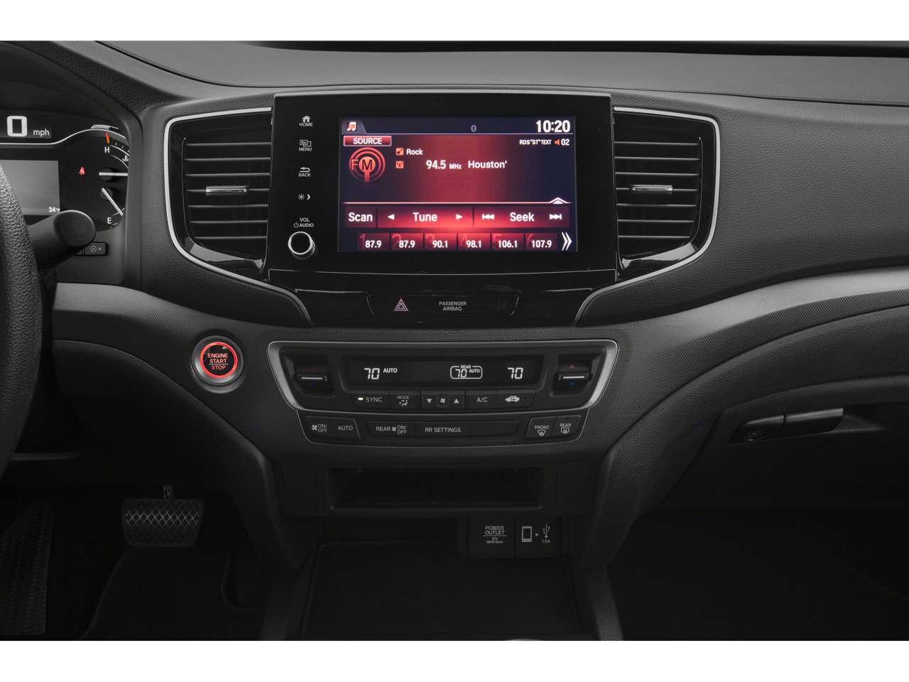 - Radio: 215-Watt Audio System w/7 Speakers -inc: subwoofer, Bluetooth® streaming audio, MP3/auxiliary input jack, Radio Data System (RDS), Speed-Sensitive Volume Compensation (SVC), 8" display audio w/high-resolution electrostatic touch screen and customizable feature settings, Apple CarPlay compatibility, Android Auto compatibility, HondaLink, SMS text message function (Compatible w/select phones w/Bluetooth®, Your wireless carrier's rate plans apply, State or local laws may limit use of texting feature, Only use texting feature when conditions allow you to do so safely.) and 1.5-amp USB smartphone/audio interface in front console (1 port)
